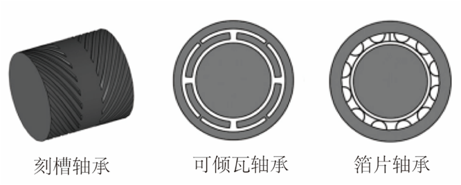 兩相對(duì)運(yùn)動(dòng)表面形成一定收斂間隙,運(yùn)動(dòng)表面的高速移動(dòng)將具有黏滯性的氣體帶入楔形間隙產(chǎn)生壓力升,進(jìn)而產(chǎn)生作用于轉(zhuǎn)子的承載力,承載力的大小隨轉(zhuǎn)速的增加而增加。楔形間隙、潤滑氣膜厚度及氣體的黏滯性是形成動(dòng)壓效應(yīng)的關(guān)鍵條件。由于擺脫了對(duì)氣源供氣系統(tǒng)的依賴,使得氣體動(dòng)壓軸承結(jié)構(gòu)簡(jiǎn)單、成本降低。但是,在啟停階段轉(zhuǎn)速較低、動(dòng)壓效應(yīng)較弱時(shí),不足以產(chǎn)生作用于轉(zhuǎn)子的支撐力,導(dǎo)致轉(zhuǎn)子與軸承內(nèi)壁接觸,產(chǎn)生嚴(yán)重的摩擦磨損,直接影響軸承的壽命。此外,氣體動(dòng)壓軸承還存在阻尼特性差,轉(zhuǎn)子過臨界難的問題。針對(duì)以上問題,研究者通過開發(fā)耐磨涂層或設(shè)計(jì)不同結(jié)構(gòu)形式的軸承來解決此問題。其中比較有代表性的氣體動(dòng)壓軸承結(jié)構(gòu)形式有刻槽氣體動(dòng)壓軸承、可傾瓦氣體動(dòng)壓軸承、箔片氣體動(dòng)壓軸承,如圖4所示。